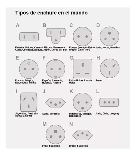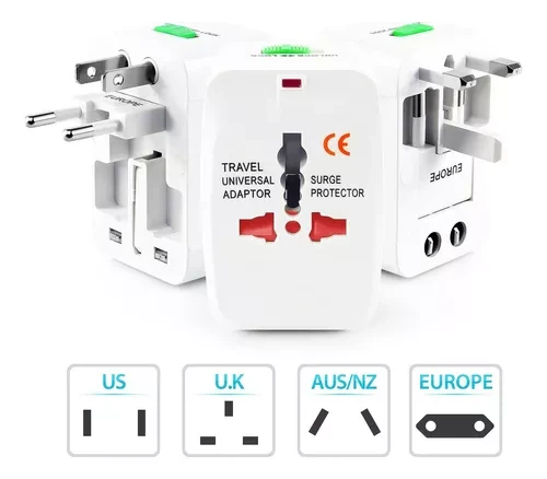 Adaptador de Enchufe Universal para Viajeros. Ideal para Viajes y Turismo. Voltaje: 110v - 240v. Dimensiones: Super compacto 7.5 x 4.5 x 5 cms. Este adaptador asegura que tus dispositivos siempre tengan carga durante tus viajes. Se ajusta a todos los tipos de enchufes, permitiendo el uso de dispositivos en más de 150 países. Es portátil y se ajusta a la mayoría de los aparatos electrónicos. Funciona en Europa, Norte y Sudamérica, Australia, Nueva Zelanda, Reino Unido y muchos otros países. No realiza la conversión de voltajes.