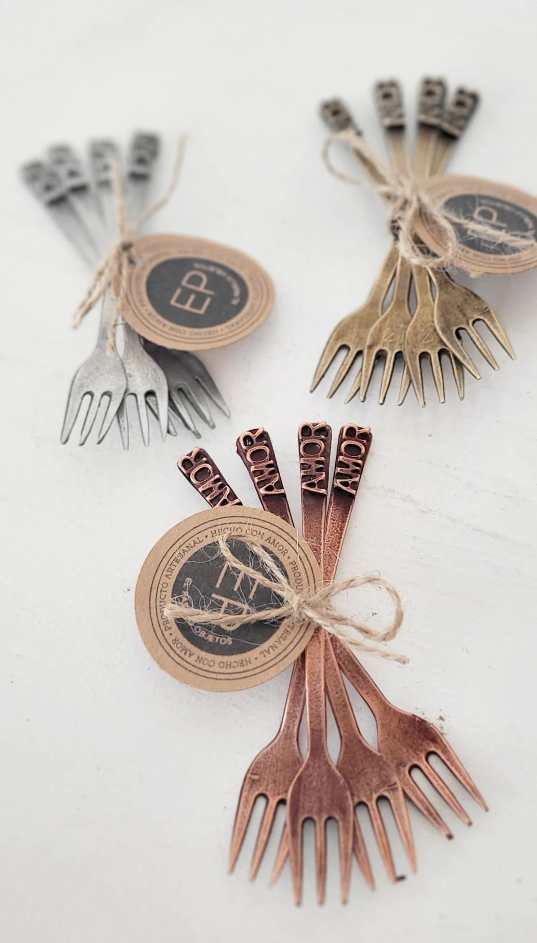 Pinchos tenedorcitos cobre, bronce o plata x4