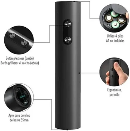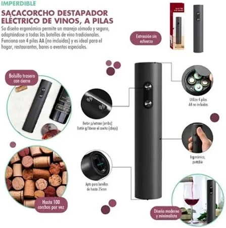 Descubre la comodidad y eficiencia del Sacacorchos Automático a Pilas de MegaCuper, el aliado perfecto para los amantes del vino. Este innovador destapador eléctrico funciona con 4 pilas AA y cuenta con un diseño ergonómico y ligero, con medidas de 252mm x 45mm y un peso de solo 300g. Fabricado con materiales de alta calidad como metal y plástico, garantiza durabilidad y seguridad alimentaria gracias a su tornillo apto para usar con alimentos. Su operación es sencilla: basta con presionar el botón inferior para atornillar el corcho y el botón superior para expulsarlo. Ideal para cualquier ocasión, este sacacorchos no incluye estuche, cortador, llavero ni imán, pero su diseño de dos tiempos asegura una extracción rápida y sin esfuerzo.