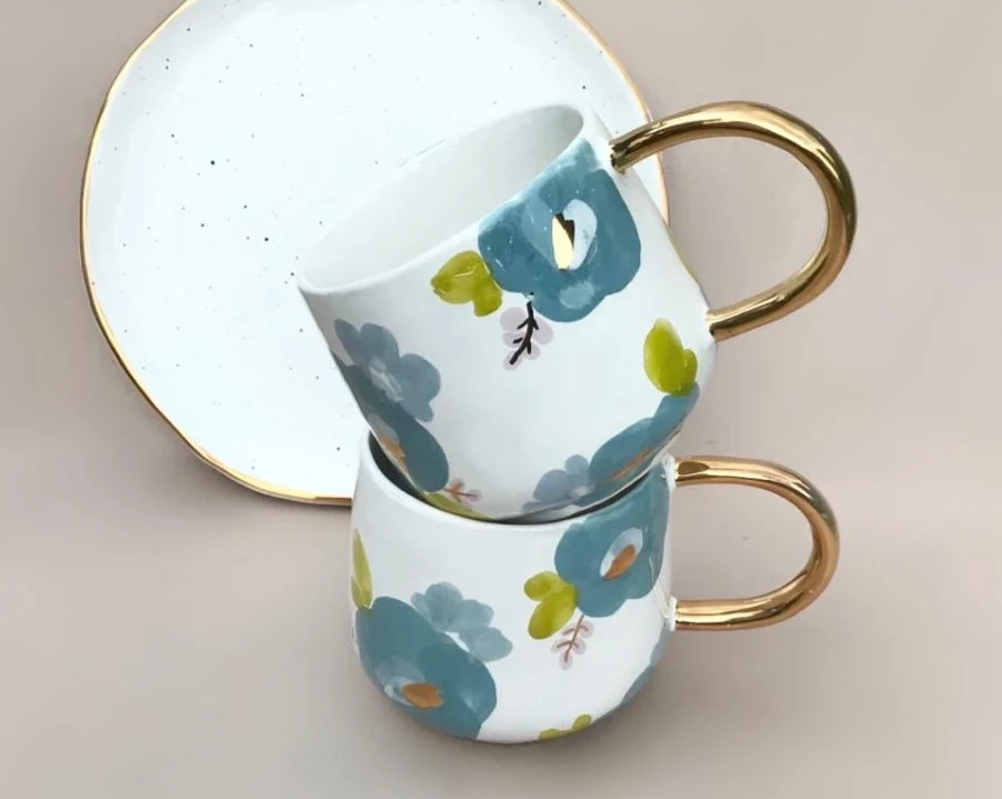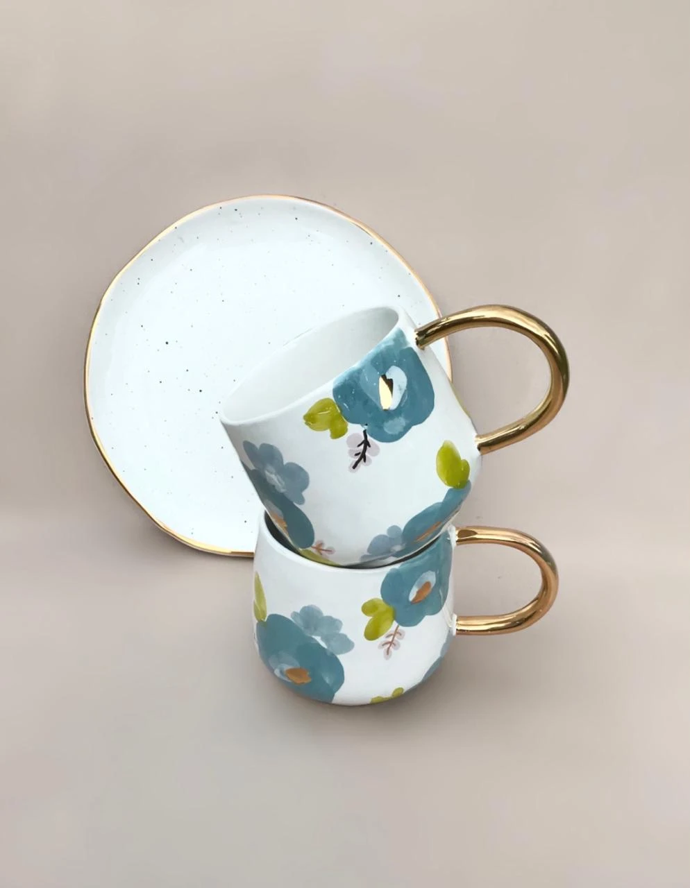 Esmalte blanco con flores en color petróleo y detalles en oro.